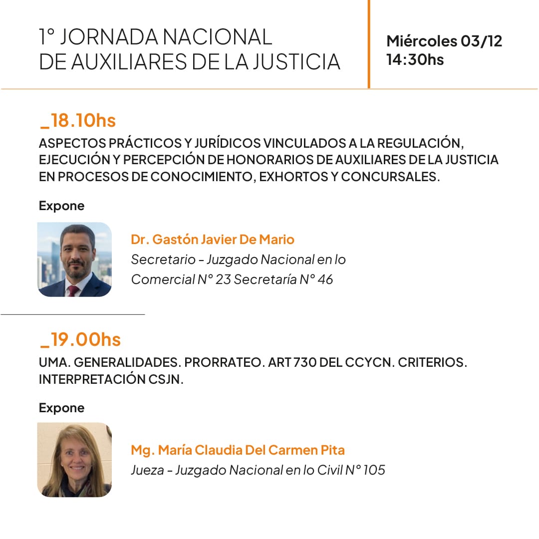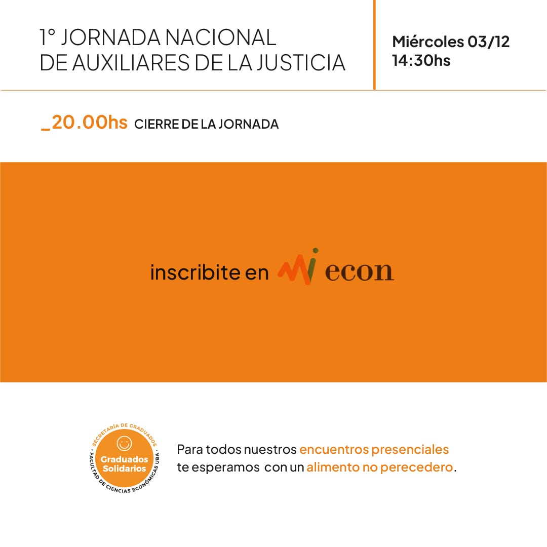 1° JORNADA NACIONAL DE AUXILIARES DE LA JUSTICIA Graduados 05/08/202527/11/2025 Ciclos y Conferencias, Destacada Conferencia Presencial: 3/12 a las 14.30hs Para inscribirse ingrese a MiEcon