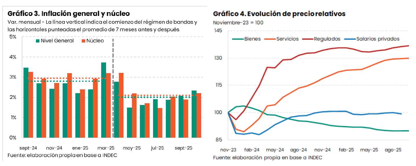 En términos de la composición de los precios relativos internos, los bienes -por lo general, transables- dejaron de abaratarse en términos reales, pero no se encarecieron (ver Gráfico 4). Análogamente, los servicios -mayormente no transables- dejaron de encarecerse, pero no se abarataron. Incluso, crecieron 5% en términos reales. Por su parte, los precios regulados crecieron apenas 2% real y los salarios privados permanecieron estancados en este lapso (+0,3% deflactado entre marzo y septiembre, a falta de datos de octubre). Por último, los precios mayoristas de los bienes importados tampoco subieron al ritmo de la depreciación. Mientras que el dólar trepó 29% entre el 15 de marzo y el 15 de octubre, este indicador subió sólo 20%.