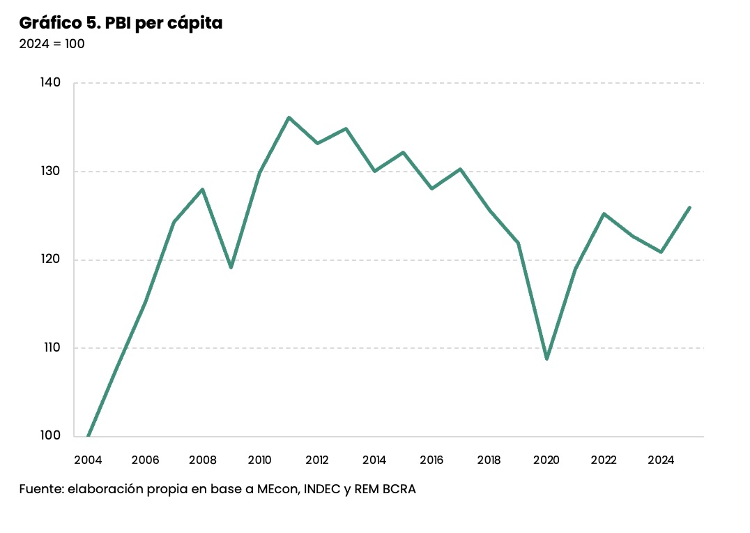 Un primer elemento que podría explicar un pass-through bajo es que la economía está operando por debajo del producto potencial. A pesar de la recuperación de la actividad de la segunda mitad del 2024, el ingreso per cápita se ubicaría este año 7,5% por debajo de su máximo registro previo, y en un valor menor al de todos los años del lapso 2010-2017 (ver Gráfico 5). Para peor, 1) todo el avance de la actividad durante este año se debe a la mejoría del rubro “intermediación financiera”, que podría estar sobreestimando el valor agregado sectorial por la metodología de cálculo, en un contexto en que se incrementó el spread de los bancos;[5] 2) el resto de los sectores tuvo un comportamiento heterogéneo, haciendo que en muchas regiones del país y rubros las ventas no repunten.[6] En definitiva, la demanda de consumo anémica podría haber causado que los empresarios absorban el incremento de costos y no lo trasladen al precio final.