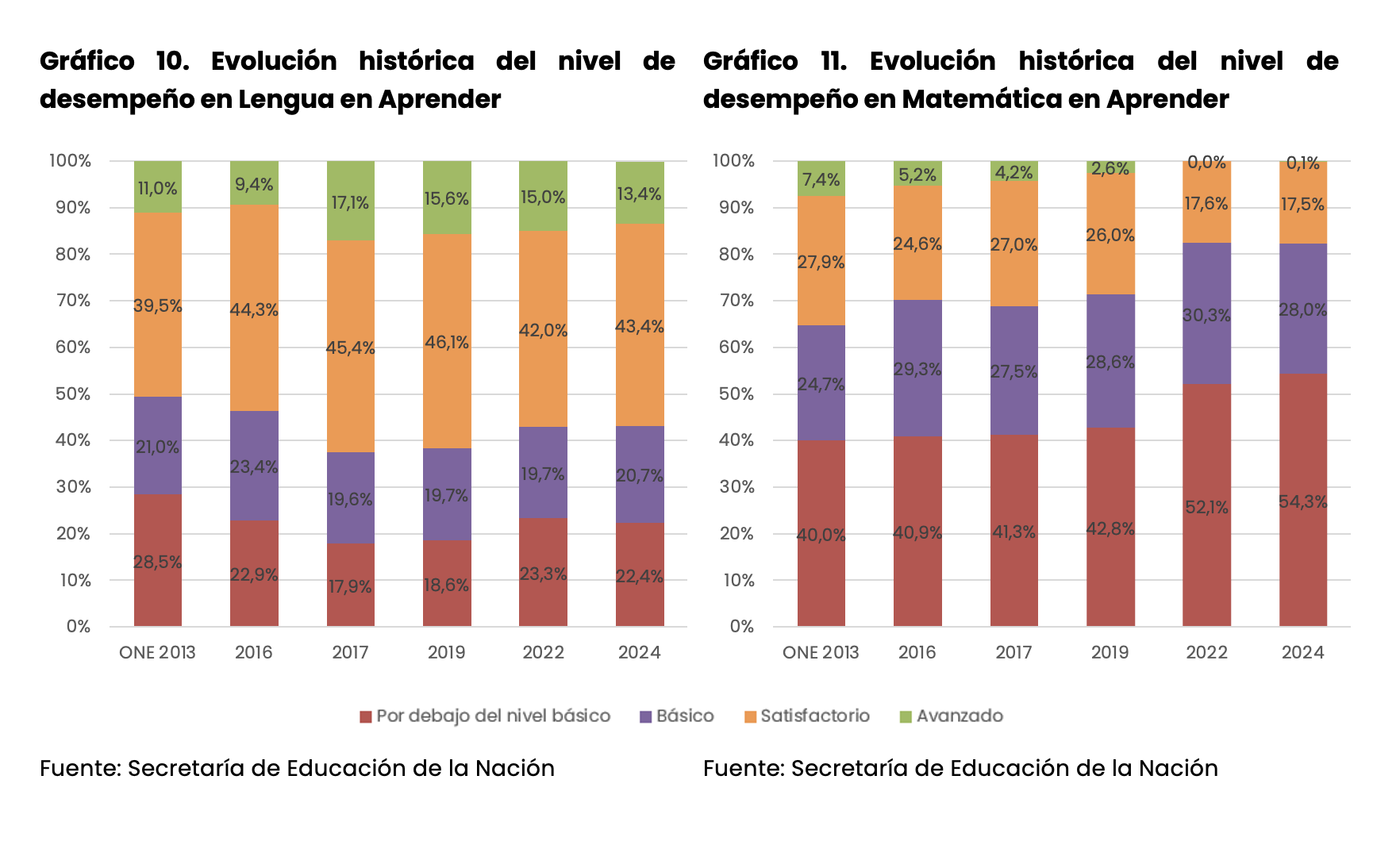 Los resultados educativos recientes evidencian un aumento en la proporción de estudiantes que se ubican por debajo de los niveles de desempeño esperados, con marcadas disparidades entre provincias. Estas brechas se vinculan estrechamente con las desigualdades en el financiamiento educativo, el gasto por alumno, las condiciones laborales docentes y el estado de las escuelas.