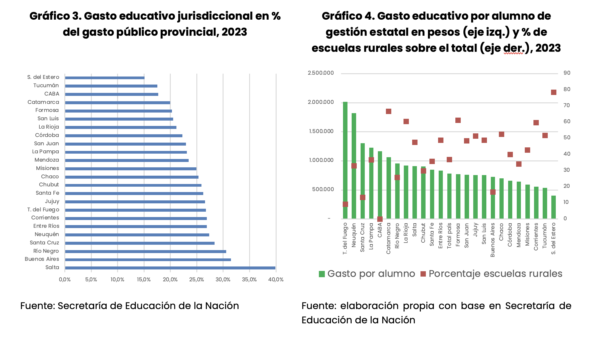 Por otra parte, el gasto por alumno también presenta marcadas disparidades entre provincias. En 2023, el gasto anual por estudiante osciló entre aproximadamente $0,4 millones en Santiago del Estero y cerca de $2 millones en Tierra del Fuego, lo que implica que este último fue un 398% superior al primero. Estas diferencias no pueden interpretarse de manera lineal ni aislada, ya que el gasto por alumno está condicionado por múltiples factores estructurales. Entre ellos se destacan la dispar capacidad de financiamiento de las jurisdicciones –asociada a su base de recursos propios y al sistema de transferencias intergubernamentales-, las (des)economías de escala vinculadas al tamaño de la matrícula y a la dispersión territorial de la población estudiantil, y las diferencias en el costo de vida y en los precios relativos de los insumos educativos, que hacen que un mismo nivel nominal de gasto tenga impactos reales distintos según la provincia. El Gráfico 4 muestra el gasto por alumno del año 2023 y la proporción de escuelas rurales sobre el total, como uno de los posibles factores que inducen a costo por alumno estructuralmente más alto: la ruralidad está típicamente asociada a una baja densidad poblacional, dispersión territorial y la necesidad de sostener servicios educativos en escuelas con matrícula reducida.