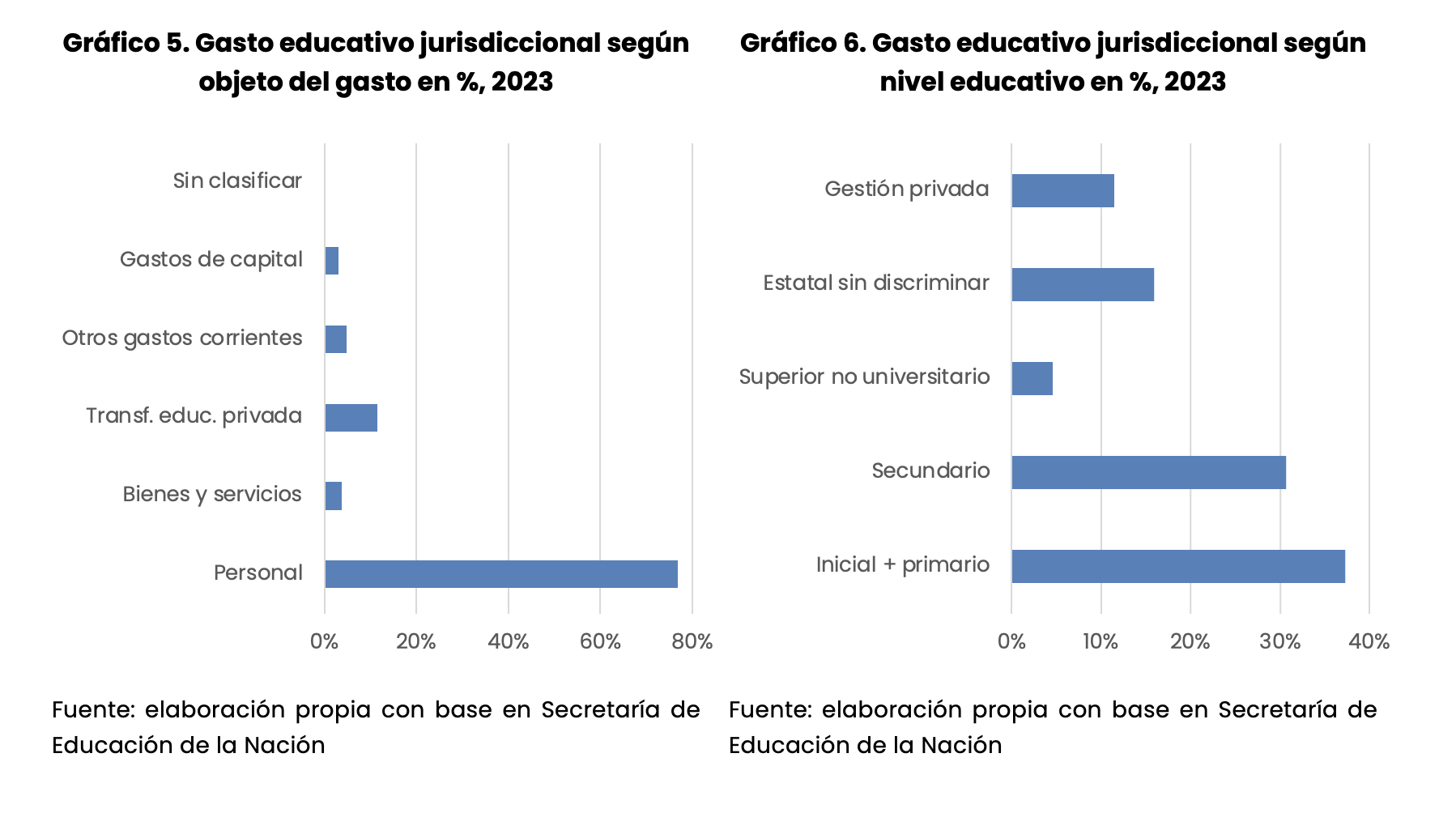 La elevada descentralización del gasto educativo referenciada en el apartado anterior implica que alrededor del 75% del financiamiento se ejecute a través de las jurisdicciones provinciales y la CABA. En estos gobiernos, la provisión de educación obligatoria ocupa un lugar protagónico, y ha representado alrededor de 80% del gasto educativo subnacional en las últimas décadas, mientras que la educación superior y universitaria abarca alrededor del 7%. En este marco, las provincias asumen la responsabilidad principal sobre el sostenimiento de los niveles inicial, primario y secundario, que concentran la mayor parte de la matrícula y del empleo docente a nivel nacional.