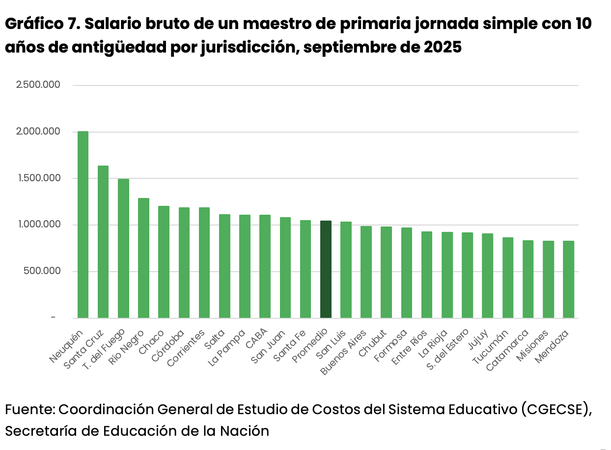 Este esquema de financiamiento descentralizado se traduce en una elevada dispersión salarial entre jurisdicciones, reflejo tanto de las asimetrías fiscales provinciales como de las diferencias en prioridades presupuestarias y capacidades de negociación. En septiembre de 2025, Neuquén –la provincia que registraba el salario bruto más elevado para un maestro de primaria de jornada simple con 10 años de antigüedad- presentaba una remuneración 142% superior a la observada en Santiago del Estero, la jurisdicción con el salario más bajo para ese mismo perfil docente.