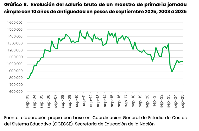 Como se observa en el Gráfico 8, los salarios docentes han evolucionado de forma muy volátil durante las últimas décadas. Puede identificarse, en primer lugar, un período de expansión entre 2003 y 2009, asociado al crecimiento del gasto público y a la recomposición del salario real tras la crisis de comienzos de siglo. Entre 2009 y 2015, el salario docente se mantuvo en niveles relativamente constantes en términos reales, aunque con elevada volatilidad.