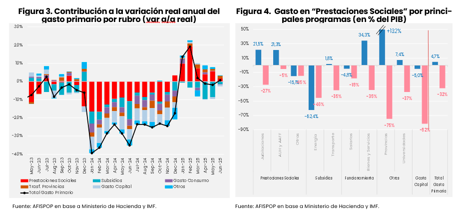 Por último, aquellas partidas que cayeron siguieron mostrando tasas de caídas similares en 2025 que en 2024, se destacan el conjunto de otros programas sociales (excluyendo pensiones y asignaciones familiares) y, en mayor medida, los subsidios a la energía. En este último caso, la caída del primer semestre de 2025 (-62% a/a real) ha sido aún mayor a la de 2024 (-46% a/a real). El abaratamiento relativo de la generación junto con el atraso cambiario y, principalmente, el aumento tarifario y de “cost recovery”, son los factores que explican esta reducción sostenida en los subsidios. Para mayor detalle recomendamos ver el Reporte de Tarifas y Subsidios de AFISPOP (https://iiep.economicas.uba.ar/publicaciones/informes-reportes/#afispop).