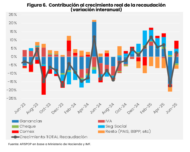 La recaudación tributaria nacional creció 2,4% (a/a) en términos reales en junio 2025, traccionada principalmente por los tributos del comercio exterior y, en menor medida, la seguridad social y el IVA (Figura 6).