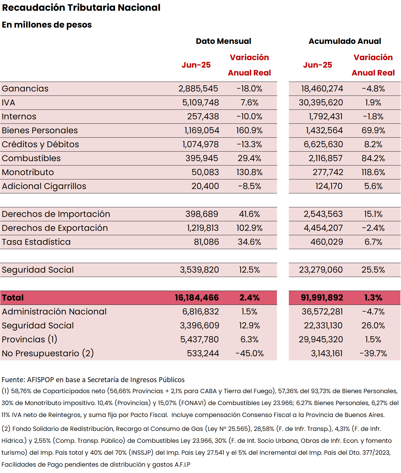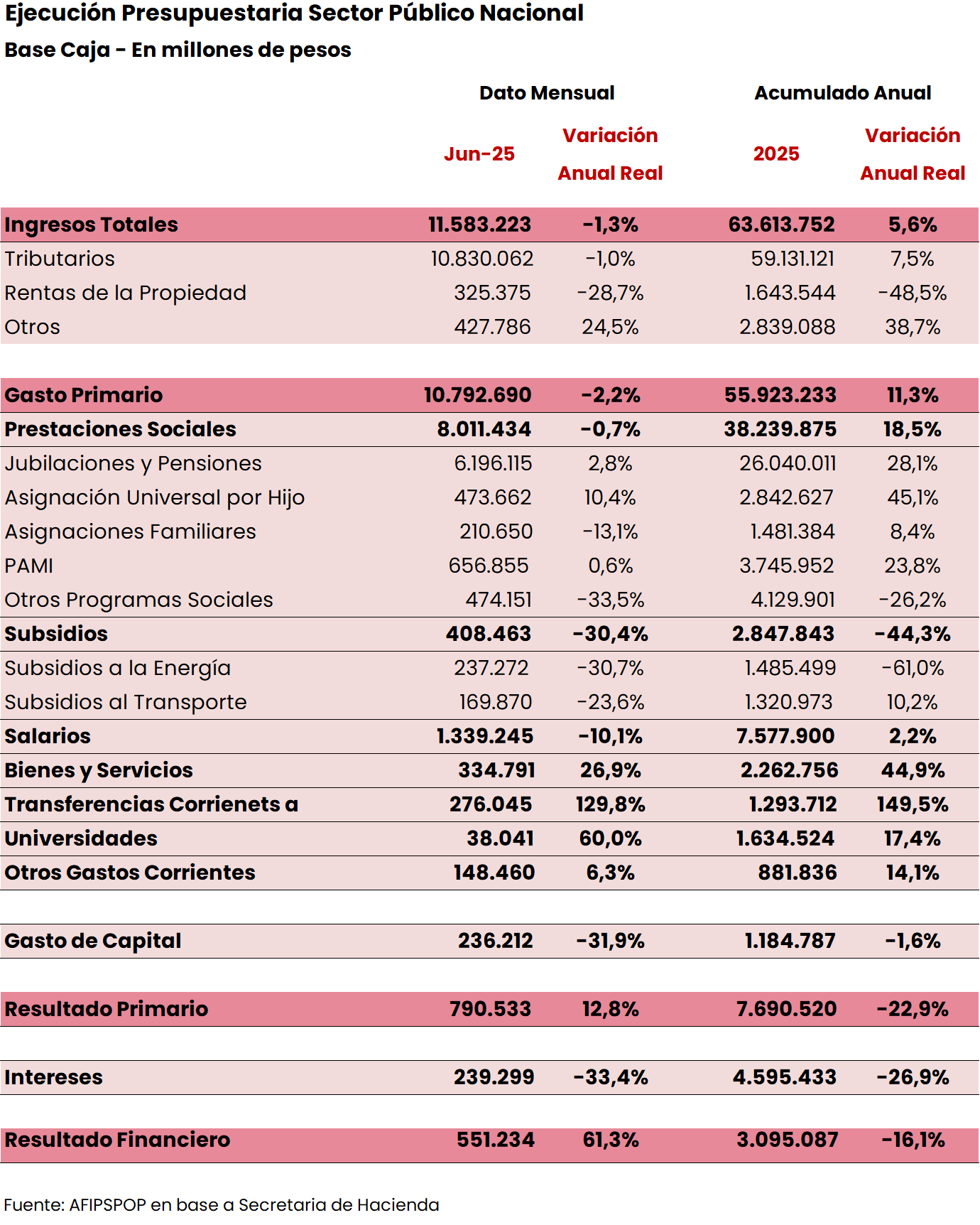 En junio 2025, los ingresos totales del SPN aumentaron 1,6% (a/a real), mientras que los gastos primarios se mantuvieron virtualmente constantes (+0,7% a/a real).