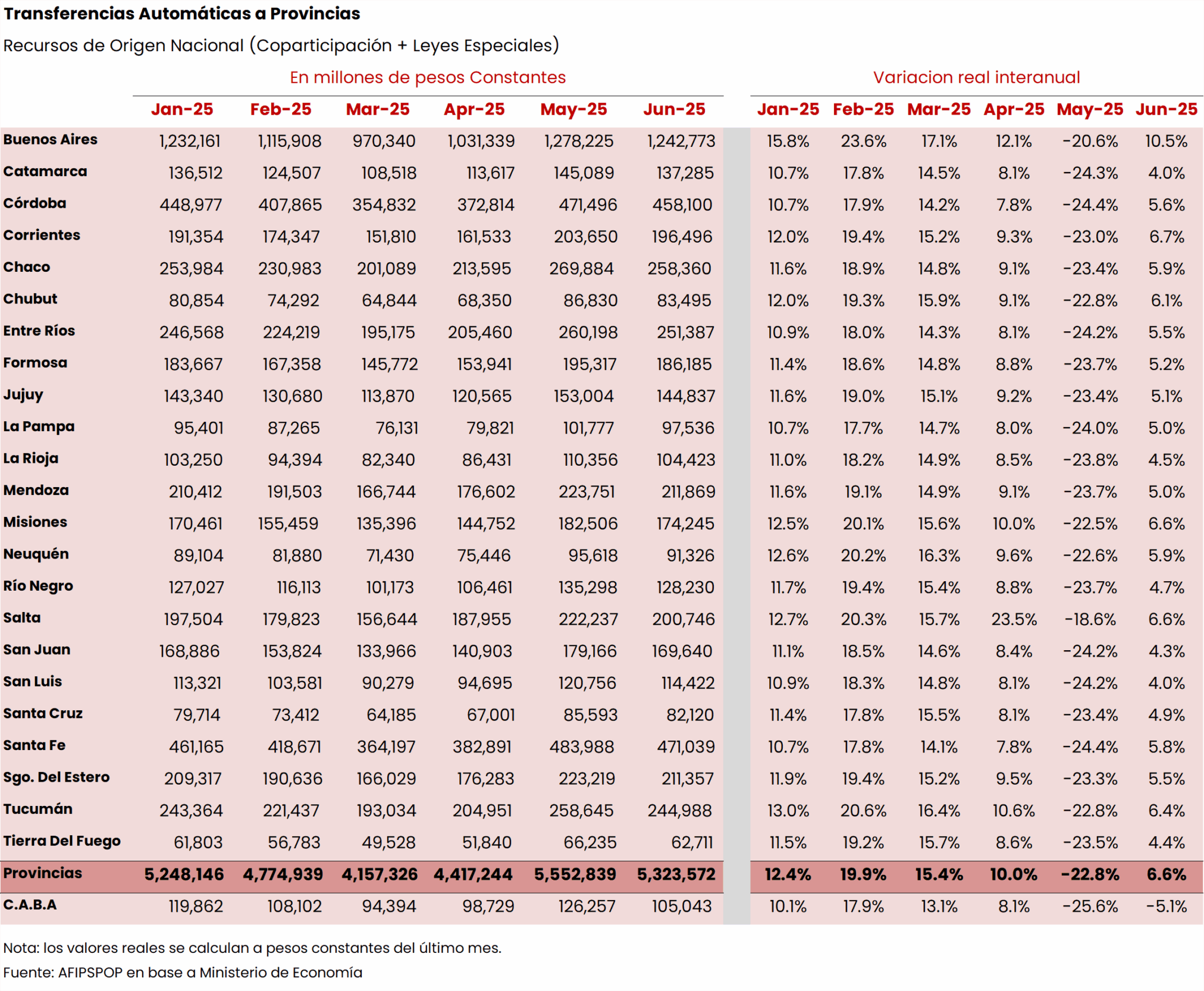 El punto anterior se vuelve particularmente relevante a la hora de estudiar la dinámica de la recaudación por destino automático a jurisdicciones (ver Anexo estadístico). En particular, los Recursos de Origen Nacional a provincias (i.e. Coparticipación más Leyes Especiales que distribuyen automáticamente la recaudación), muestran para junio un aumento relativamente similar para cada provincia con la excepción de CABA que registra una caída de 5% (a/a real). Esto se explica enteramente por lo ocurrido con Bienes Personales, toda vez que CABA no forma parte de las jurisdicciones receptoras de la distribución automática de dicho impuesto. Vale recordar que BBPP no forma parte de la masa de coparticipación, sino que tiene una asignación específica mediante la cual se distribuye su recaudación entre provincias con mismos criterios que la Coparticipación, pero sin incluir a CABA.