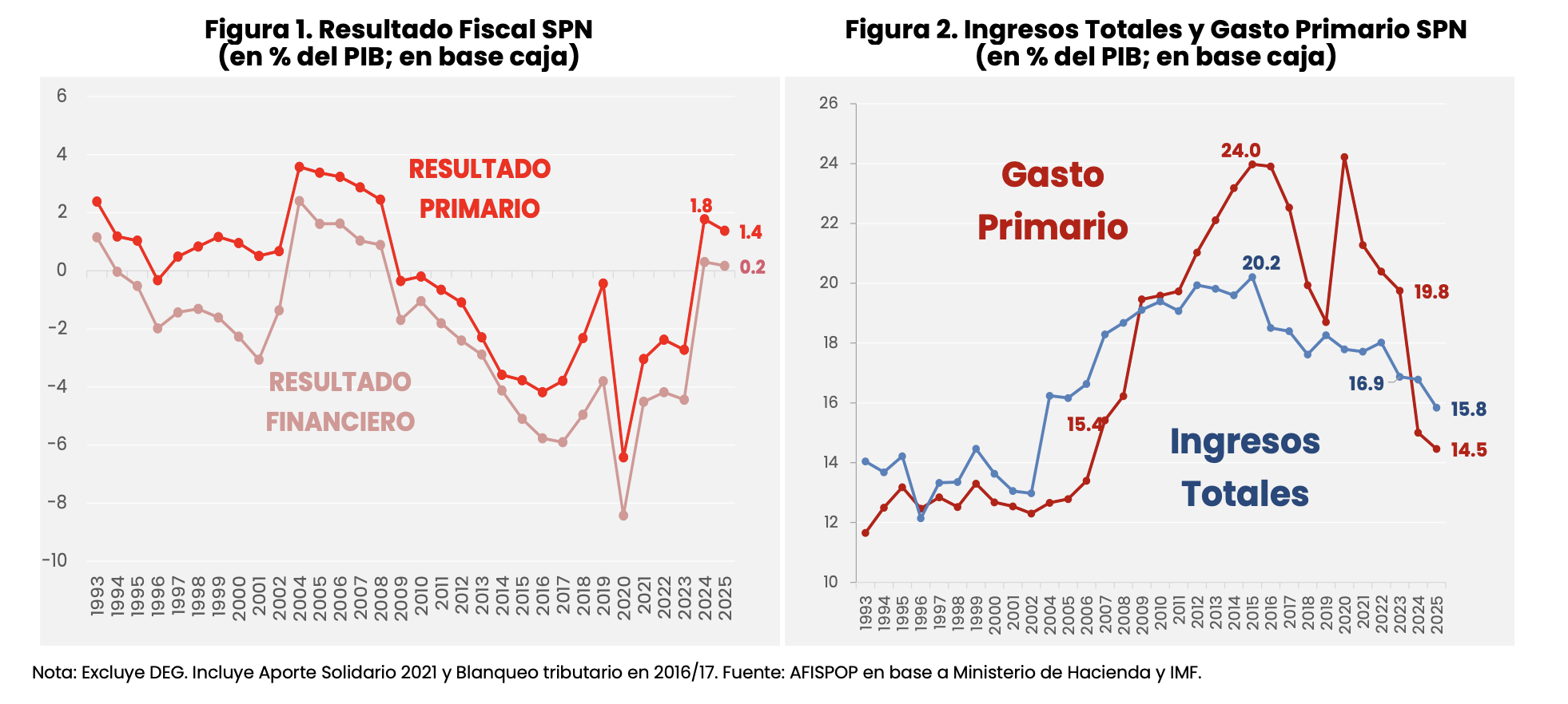 El Sector Público Nacional (SPN) logró acumular un superávit primario equivalente a 1,4% del PIB, sosteniendo buena parte de la consolidación fiscal del 2024. Sumando el pago de intereses, se registró un superávit fiscal de 0,2% del PIB (Figura 1)[1]. La reciente publicación de los datos fiscales de diciembre, permiten cerrar el año 2025 y hacer algunas evaluaciones y observaciones de mediano y largo plazo. En particular, en diciembre el SPN registró un déficit primario por primera vez en el año, cercano a AR$2.9 billones, equivalente a 0,3% del PIB, siguiendo la tradicional estacionalidad del gasto en el último mes del año. El superávit primario acumulado en 2025, equivalente a 1,4% del PIB, permitió al gobierno preservar en gran medida el esfuerzo fiscal realizado en su primer año de gestión. Este proceso de consolidación fiscal rompe con un proceso de casi 14 años (desde 2009) de recurrentes desbalances primarios, y vuelve a balances primarios similares a los de los años 90s (Figura 1).