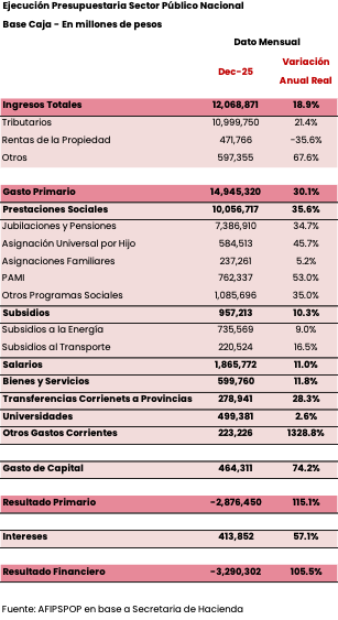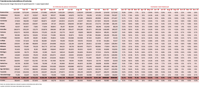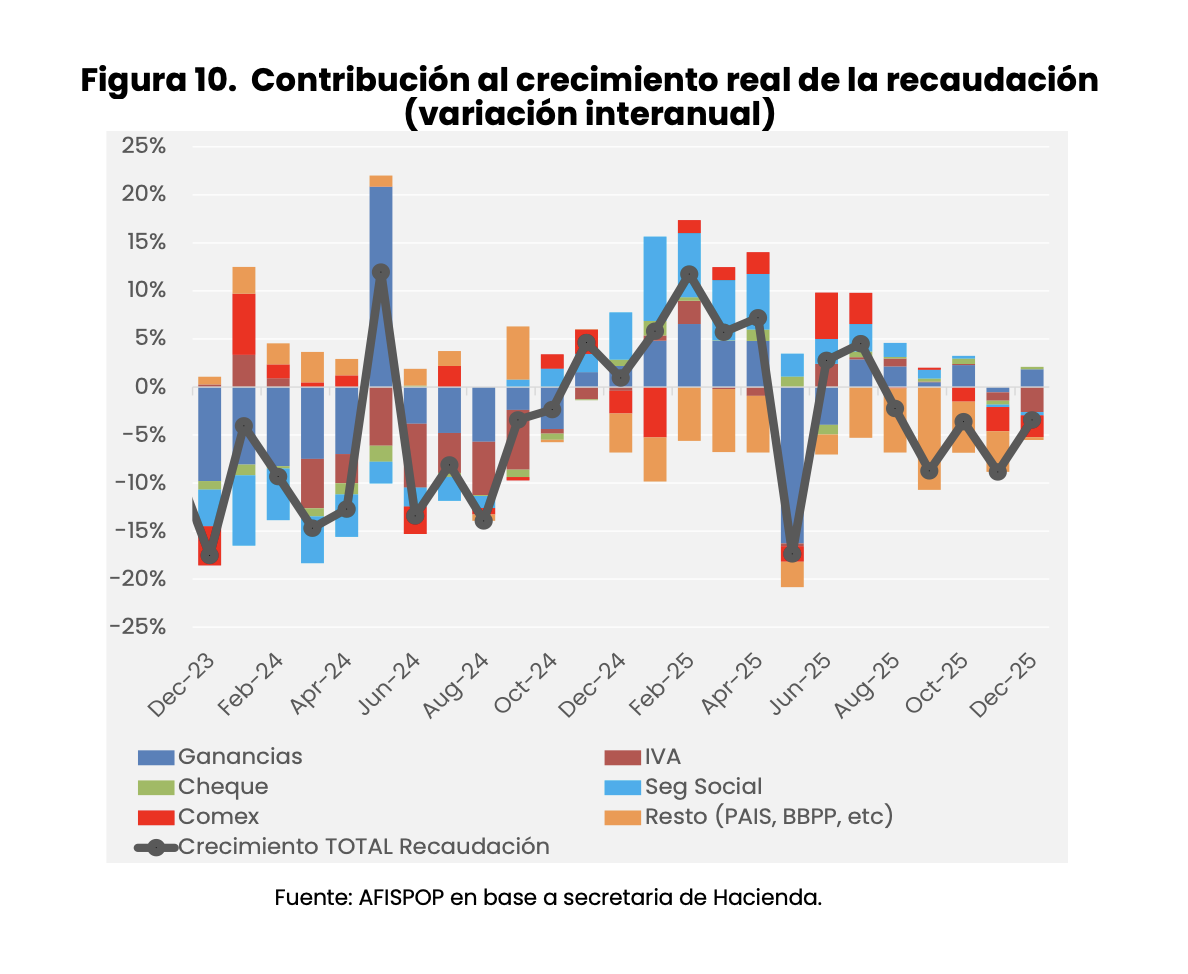 Por el contrario, el impuesto a las Ganancias aumentó 9% (a/a real) y compensó, aunque solo parcialmente, estas caídas. Esto se explicó por “mayores ingresos de anticipos de Ganancias Sociedades en relación al año anterior, debido a la modificación en el Régimen de Anticipos implementada por RG 5.685/2025. El séptimo anticipo del cierre diciembre se calculó con la alícuota del 11,11% en tanto el año pasado se aplicó la de 8,33%” según ARCA.