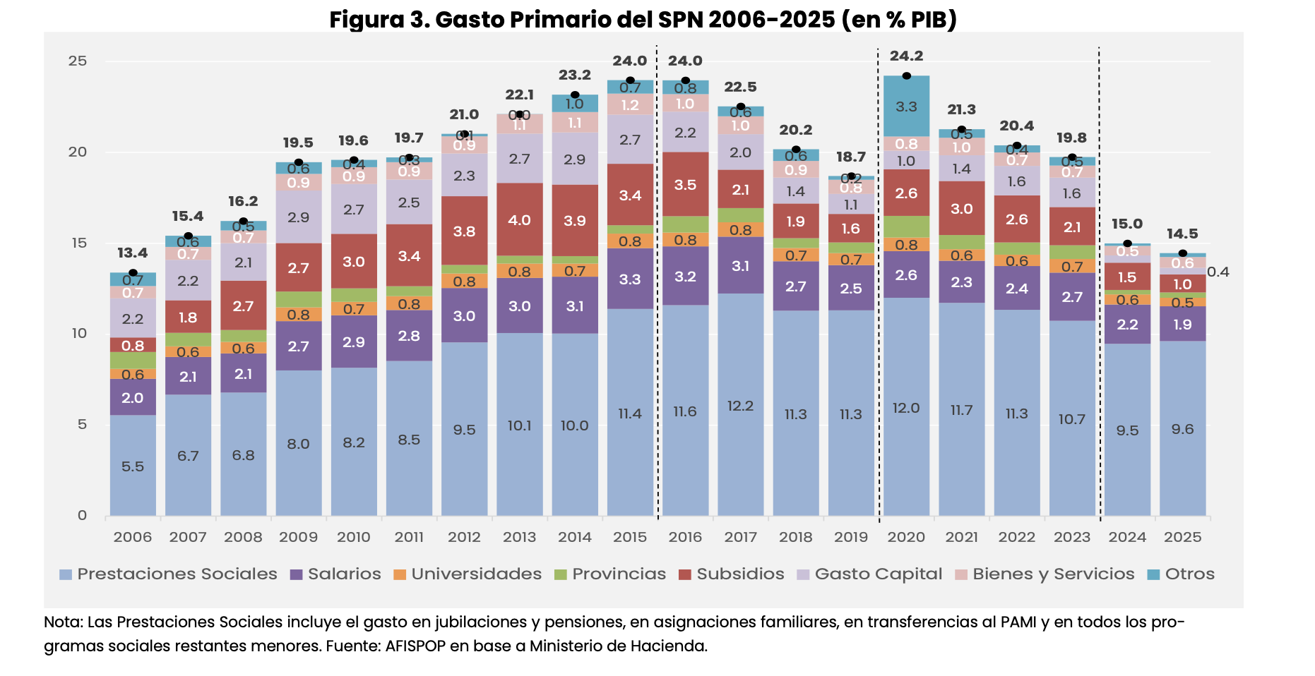 En 2025, el gasto primario del Sector Público Nacional (SPN) se ubicó en torno al 14,5% del PIB, reduciendo el tamaño del Estado nacional a niveles comparables a los de 2007 (Figura 3). Desde una perspectiva de largo plazo, la trayectoria del gasto público muestra una dinámica particularmente singular. Como se ha señalado reiteradamente en los sucesivos Reportes Fiscales de AFISPOP, la inédita expansión fiscal iniciada en 2006–2007 llevó al gasto primario a máximos históricos en el transcurso de apenas una década, impulsada fundamentalmente por el crecimiento de los gastos corrientes y, en particular, de los gastos de carácter “prestacional” y salarial.
