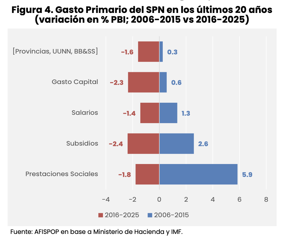 Cabe señalar, asimismo, que la evolución fiscal de los últimos años no responde a un proceso lineal de convergencia hacia la sostenibilidad, sino que estuvo marcada por avances y retrocesos significativos. Aun así, al analizar comparativamente las últimas dos décadas, resulta claro identificar los principales impulsores de la expansión y los componentes que explicaron su posterior reversión (Figura 4). Mientras que el gasto en Prestaciones Sociales —entendido como una agregación amplia del gasto social y previsional— solo revirtió aproximadamente un tercio de la expansión observada en la década previa, el resto de las partidas (subsidios económicos, salarios, gasto de capital, transferencias a provincias y universidades, entre otras) se contrajo en una magnitud equivalente o incluso superior a su expansión anterior. Este patrón vuelve a poner de relieve cómo la composición del crecimiento del gasto público genera condicionantes de mediano y largo plazo que terminan reconfigurando de manera significativa el resto del presupuesto, particularmente en contextos de ajustes fiscales inevitables.