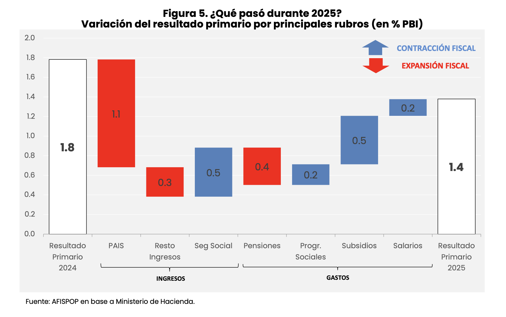 Año 2025: la pérdida de recursos tributarios y la parcial recuperación del gasto previsional derivaron en una leve reducción del superávit primario, que pasó de 1,8% del PIB en 2024 a 1,4% del PIB en 2025 (Figura 5). Tal como se anticipó a lo largo del año en los Reportes Fiscales de AFISPOP, la propia dinámica de las reformas fiscales preanunciadas durante 2024 hacía prever un mayor esfuerzo fiscal si el objetivo era sostener el nivel de ahorro público alcanzado ese año. En particular, la eliminación del impuesto PAIS implicó una pérdida de recursos tributarios equivalente a 1,1% del PIB. A ello se sumaron las sucesivas reducciones de alícuotas en los Derechos de Exportación y otros factores (ver Sección Recaudación), que generaron una caída adicional de 0,3% del PIB en la recaudación de otros impuestos. Por el lado del gasto, la modificación de la fórmula de movilidad jubilatoria introducida en 2024 ya había predeterminado un sendero de mayor gasto previsional en un contexto de estabilidad o desaceleración inflacionaria como el observado, lo que se tradujo en un aumento del gasto en seguridad social equivalente a 0,4% del PIB en 2025, contribuyendo a la reducción del superávit.
