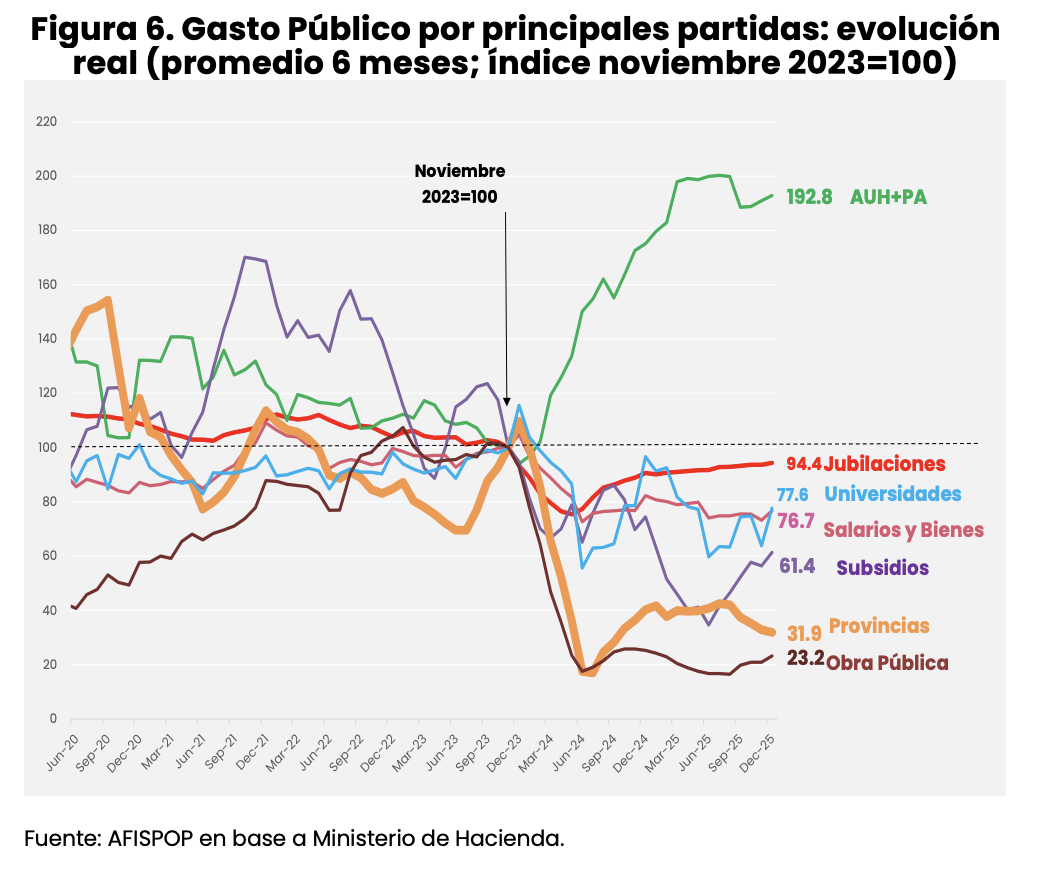 Bajo esta óptica, los resultados son elocuentes. En primer lugar, se observa una contracción real generalizada en prácticamente todas las partidas, con la excepción de los programas de transferencia de ingresos a los hogares más pobres (AUH y Prestación Alimentar), cuyo valor real prácticamente se duplicó en el transcurso de dos años. En contraste, el resto del gasto primario —que en conjunto se redujo 29% en términos reales en el mismo período— exhibe dinámicas marcadamente heterogéneas. Mientras que el gasto en jubilaciones se ubica apenas 6% por debajo de su nivel real de hace dos años, como resultado de la rápida desaceleración inflacionaria y su impacto sobre la fórmula de movilidad, en el extremo opuesto se encuentran el gasto de capital y las transferencias a provincias, que registran caídas del 70% y 80%, respectivamente. En una magnitud intermedia, los subsidios económicos, los gastos operativos y las universidades nacionales cerraron 2025 con reducciones reales del 40%, 24% y 23%, respectivamente. Cabe destacar que estos valores corresponden a promedios móviles de los últimos seis meses, con el objetivo de mitigar efectos estacionales.