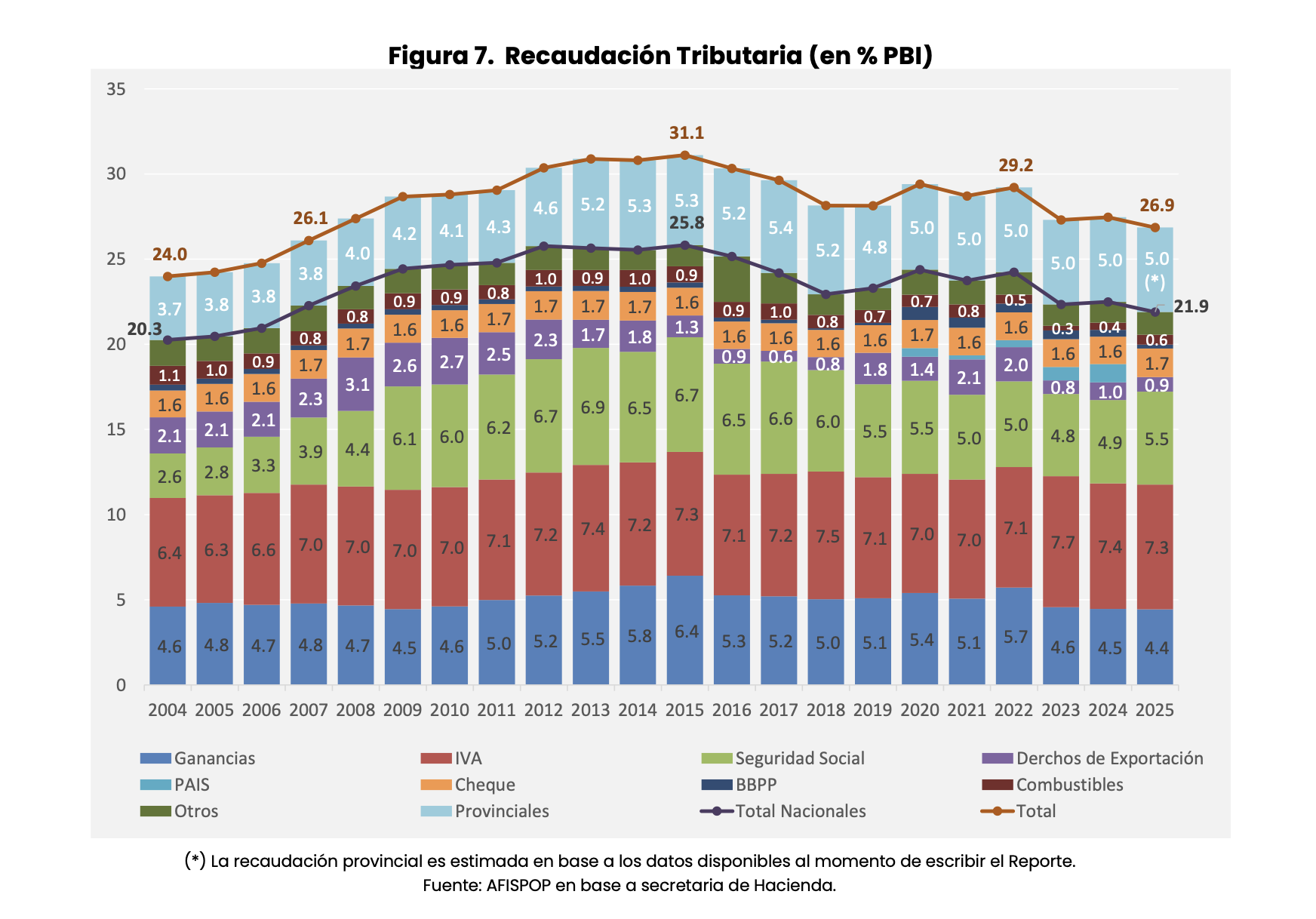 La recaudación tributaria nacional bajó levemente en 2025 y cerró con una presión estimada en 21.9% del PIB. Sumando los impuestos provinciales, la presión tributaria total habría cerrado en 26.9% del PIB, el registro más bajo desde 2007 (Figura 7). La recaudación nacional bajó 0,6% del PIB en 2025. Esto se explica principalmente por la eliminación del impuesto PAIS y la reducción en BBPP y Derechos de Exportación, que se vio parcialmente compensada por una mayor recaudación en otros impuestos, esencialmente los ligados a la seguridad social. El vencimiento del impuesto PAIS que produjo una pérdida de recursos tributarios equivalente a 1,1% del PIB, sumado a la caída de 0,2% del PIB en la recaudación de Derechos de Exportación y de 0,2% del PIB en Bienes Personales, ambos derivados de cambios en la normativa a lo largo del año o en 2024. Sin embargo, la propia recuperación económica y salarial, especialmente a inicios de 2025, generó una recuperación en la recaudación de tributos de la seguridad social, por el equivalente a 0,6% del PIB. Asimismo, la gradual actualización del impuesto a los combustibles también generó marginalmente una mayor recaudación, contribuyendo a amortiguar la baja impositiva antes comentada. En el agregado, el mix de políticas y resultados económicos, generó una caída en la recaudación nacional de “solo” 0,6% del PIB.
