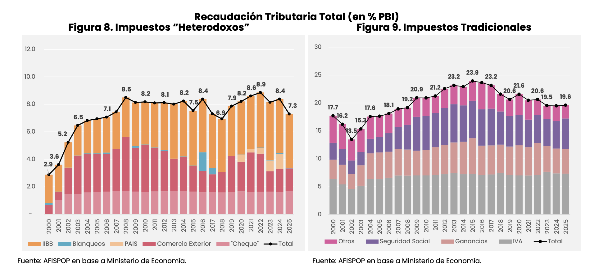 Sin embargo, como se ha señalado reiteradamente en estos Reportes Fiscales, la evolución de la movilización de recursos tributarios en Argentina distó de ser el resultado de una reforma tributaria integral, coherente y planificada. Por el contrario, el fuerte incremento de la recaudación observado durante los años 2000 estuvo impulsado fundamentalmente por la proliferación de impuestos no convencionales —frecuentemente caracterizados como “heterodoxos” o de “emergencia”—, los cuales suelen presentar efectos particularmente adversos sobre el crecimiento económico, las exportaciones y, en algunos casos, la equidad distributiva. Esta dinámica convirtió a Argentina en un caso atípico en la práctica internacional: la recaudación proveniente de este tipo de tributos, poco utilizados a nivel global, llegó a representar cerca del 9% del PIB y algo menos del 30% de la recaudación total.