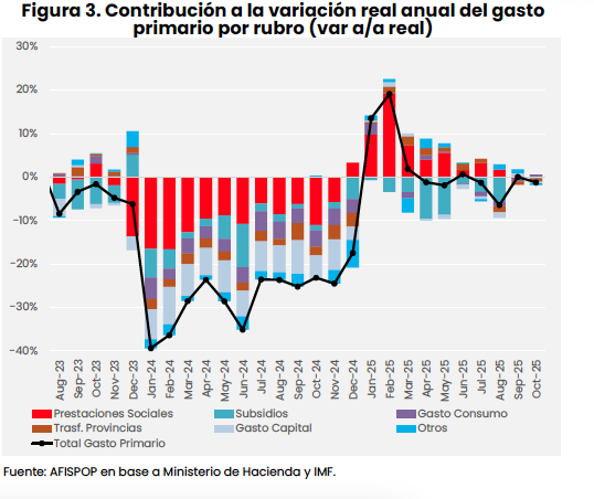 En octubre 2025, el gasto primario cayó levemente (-1,2% a/a; real), mientras que los ingresos del SPN cayeron 2,4% (a/a; real), por efecto de una menor recaudación.
