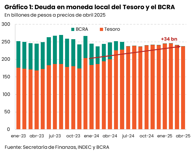 Desde fines de 2023, la deuda pública del Gobierno Nacional en moneda doméstica creció 34 billones de pesos a precios constantes de abril de 2025 (+16%; ver Gráfico 1). Así, la deuda denominada en pesos representa más de un tercio del PIB.