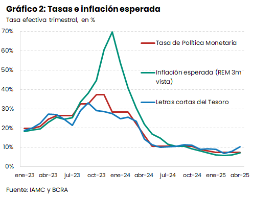 Tras esta primera etapa de tasas negativas, las letras del Tesoro empezaron a ofrecer rendimientos superiores a la inflación esperada, retomando su objetivo de desalentar la demanda de activos externos, tanto de forma directa en el mercado financiero (a través del MEP) como de manera indirecta mediante el adelanto de importaciones. Con la flexibilización cambiaria reciente, el rol de las tasas del Tesoro como instrumento para desalentar la demanda de divisas se reforzó. En este contexto, las tasas reales positivas promueven el ahorro en pesos e impulsan la venta de dólares, bajando su cotización, que a fines de mayo se sitúa en torno a los $1.150.