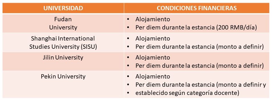 Por su parte, las instituciones chinas otorgarán una ayuda para la estancia, de acuerdo con el siguiente cuadro: