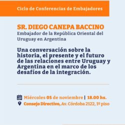 El próximo miércoles 5 de noviembre a las 18:00 hs., en el Salón del Consejo Directivo ubicado en Av. Córdoba N° 2122, recibiremos al Embajador del Uruguay en la Argentina, Diego Cánepa Baccino, en el marco del Ciclo de Conferencias de Embajadores. En esta oportunidad, el Embajador dialogará sobre
